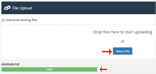 5. Click on Select File and choose the file you want to upload from your computer. Click open and the upload process will begin. You can also drag and drop files from your computer in the upload box.