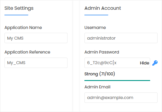 • Admin Username: Your new PyroCMS username (for security reasons, do not use the administrator or the admin username).